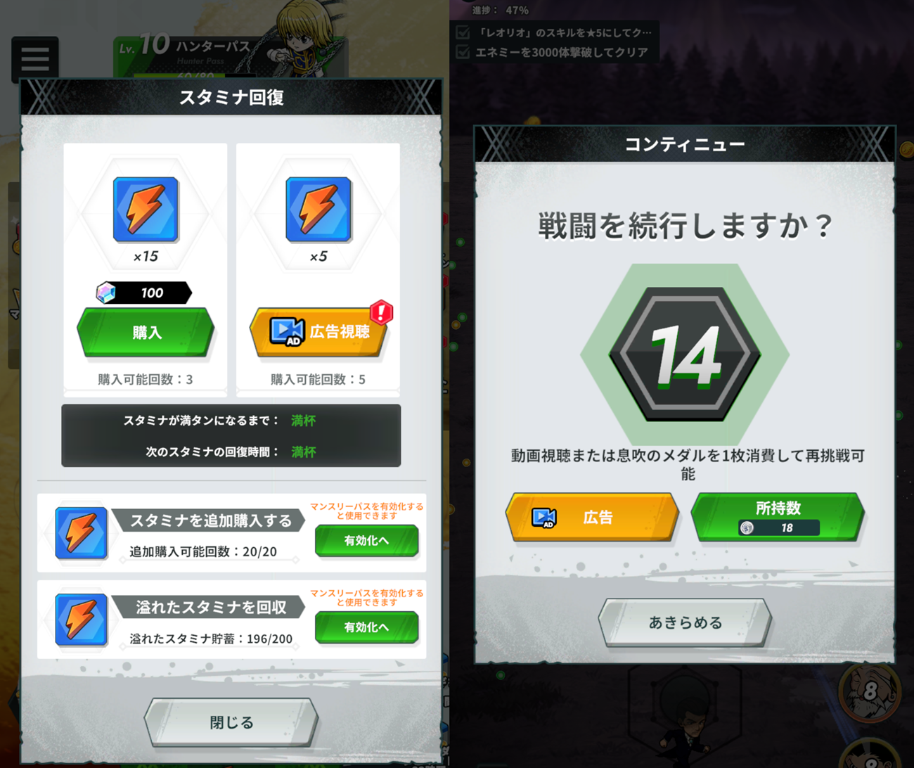 HUNTER×HUNTER NEN×SURVIVOR(ネンサバ)のマンスリーパスにある広告免除ライセ
