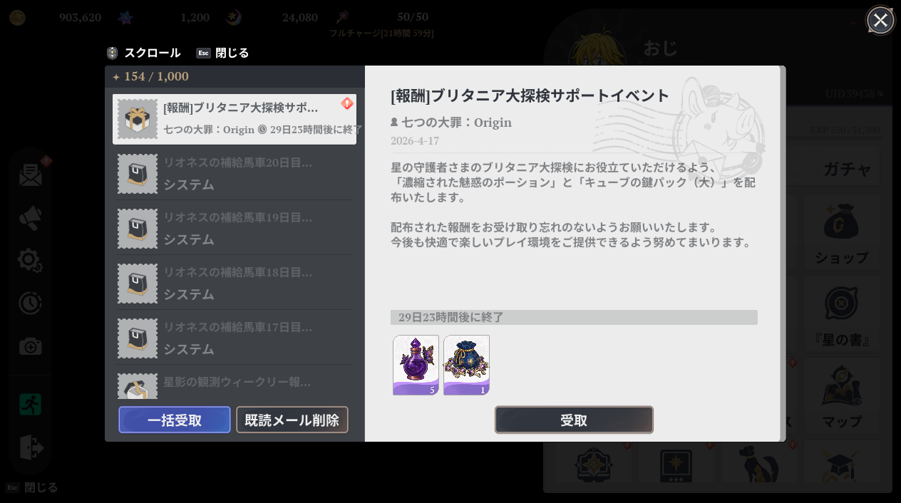 七つの大罪Origin(ナナオリ)の星の書レベル41に到達しました。レベル40から41までがえらい長
