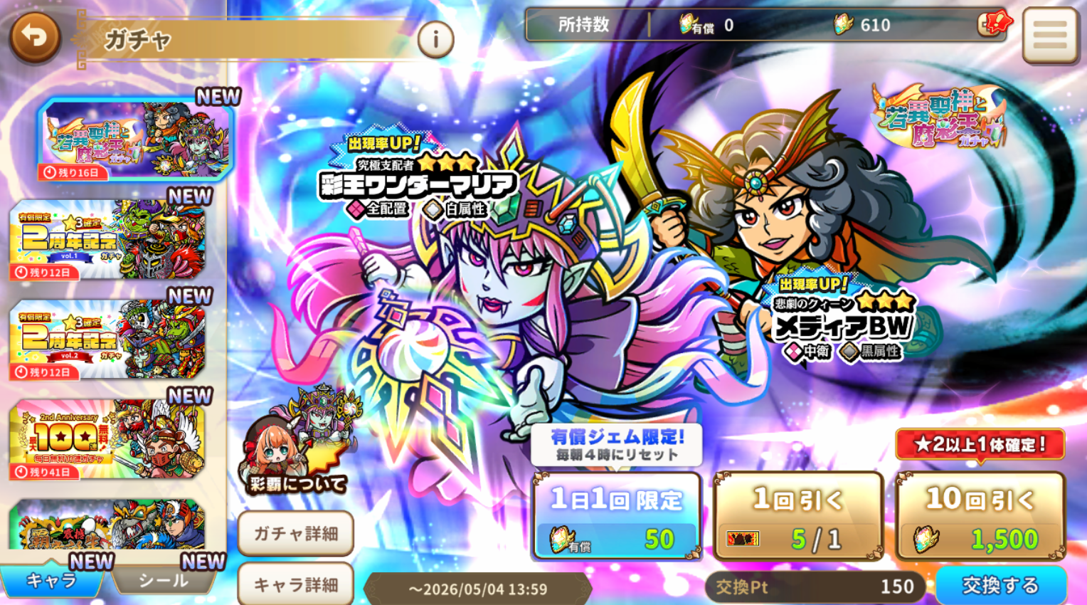 2026-4-17 2周年キャラとして究極支配者彩王ワンダーマリア、 悲劇のクィーンメディアBW追加