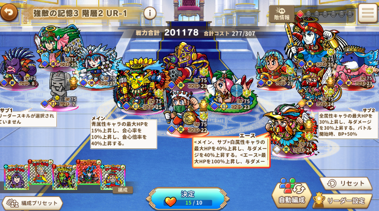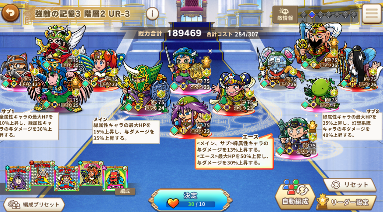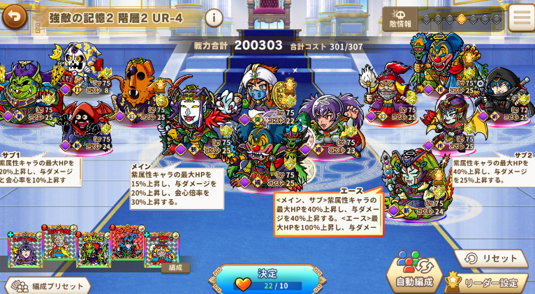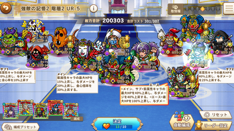 階層2クリア編成。脆弱対策してれば勝てるだろうと思ったのは間違いでした。神帝男ジャックのシールドと与ダメージダウン系のサブに詰めこまないと耐えきれない。予兆に前衛の奥義は必須。
