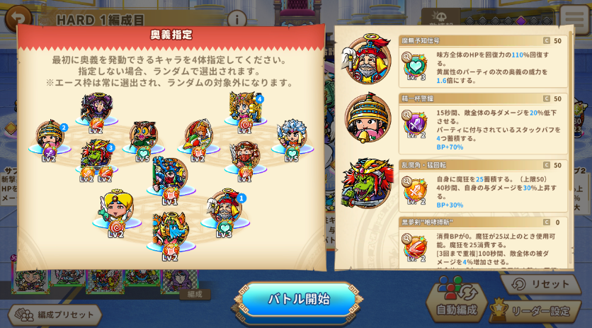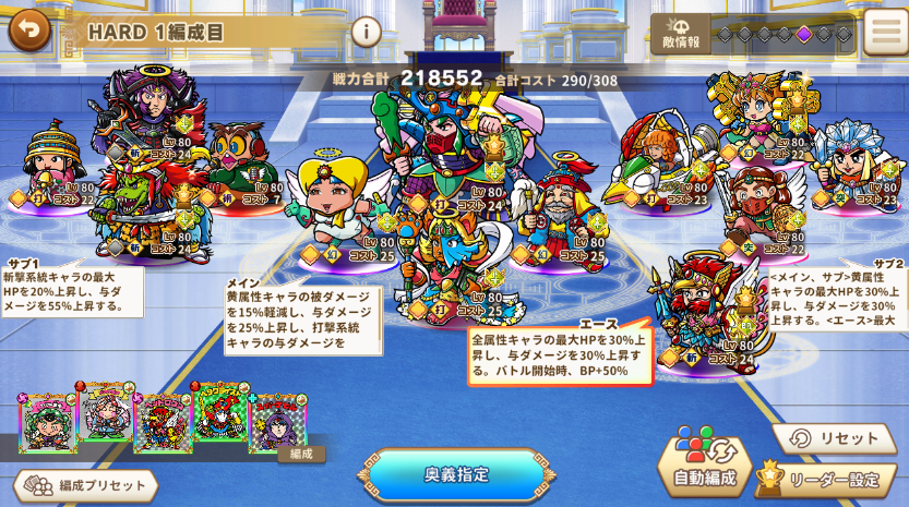 ビックリマンワンダーコレクションでは10月23日から大乱闘ダビデブが開始です。黒戒律伝道王ダビデブの属性は紫なので有利属性は黄色。そしてダビデブは斬撃に弱い特徴があります。希望の聖戦士ヘッドロココや聖影の嘆きゴーストアリババ向きの敵となっています。とりあえず上記の編成でオートでクリア。