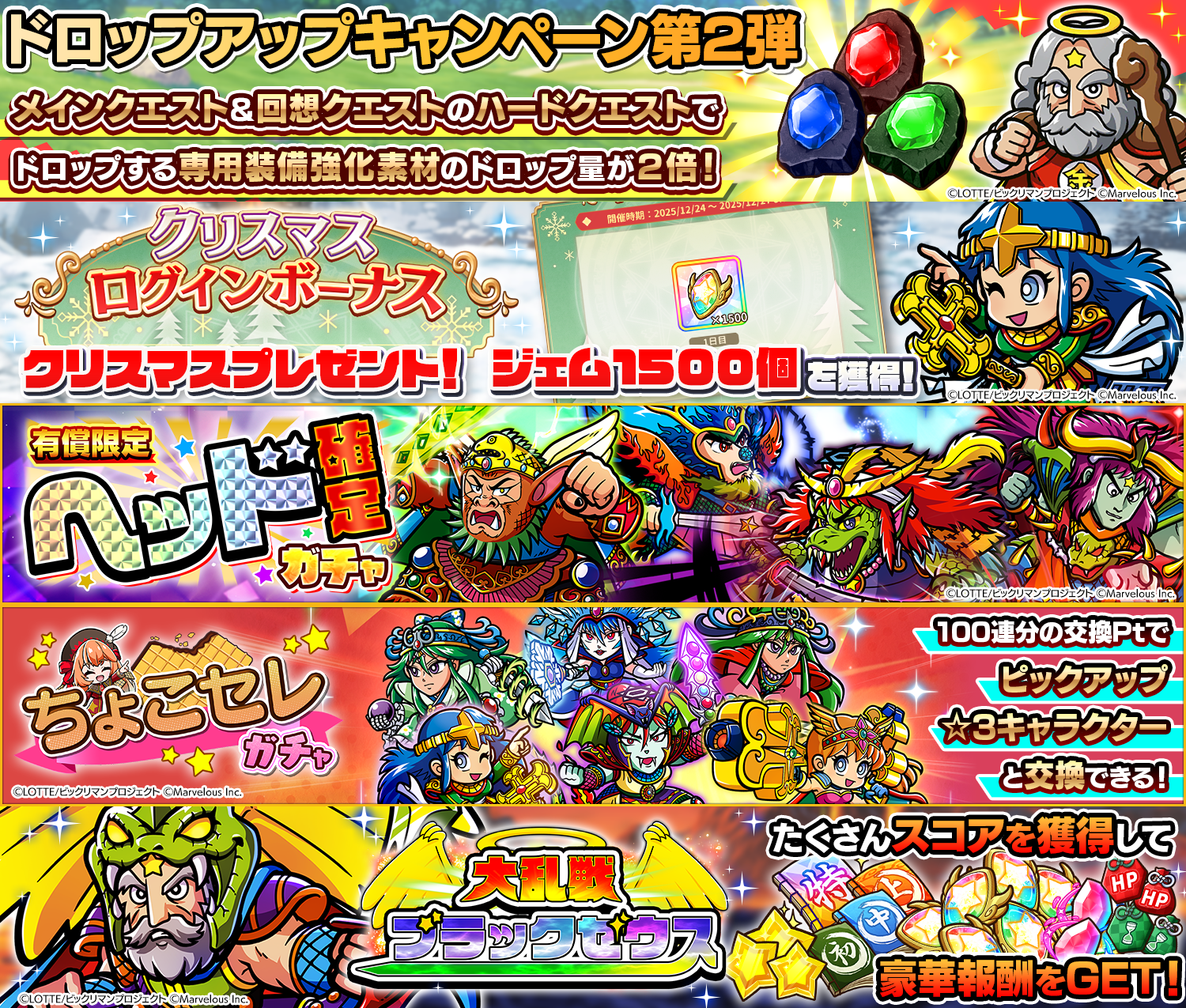 ビックリマンワンダーコレクション(ワンコレ)の2025年のクリスマスはログインボーナスで1500ジェムの配布となるそうです。また24日にはメンテナンス「12月24日(水) 13:30〜15:30」もあり、大乱戦やお得なガチャが開始です。