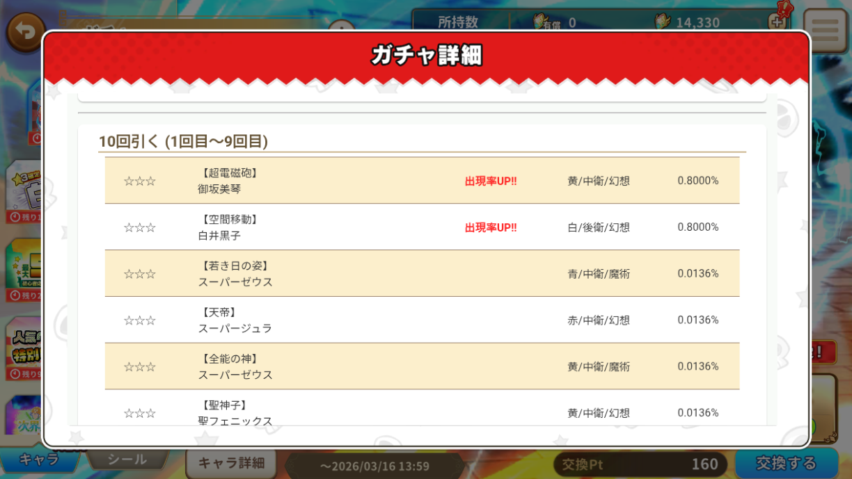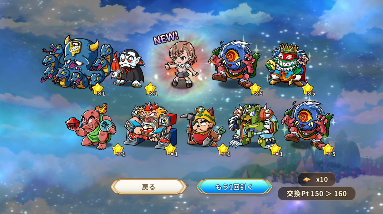 2体出すまでに160連。白井黒子1凸、御坂美琴無凸です。これは性能見て天井までいって凸増やそうかな。以下でガチャ動画もチェックできます。ガチャも超電磁砲のコラボ特別仕様となっています。黄色は★2なので喜んではいけません。御坂美琴も白井黒子もヘッドになります。