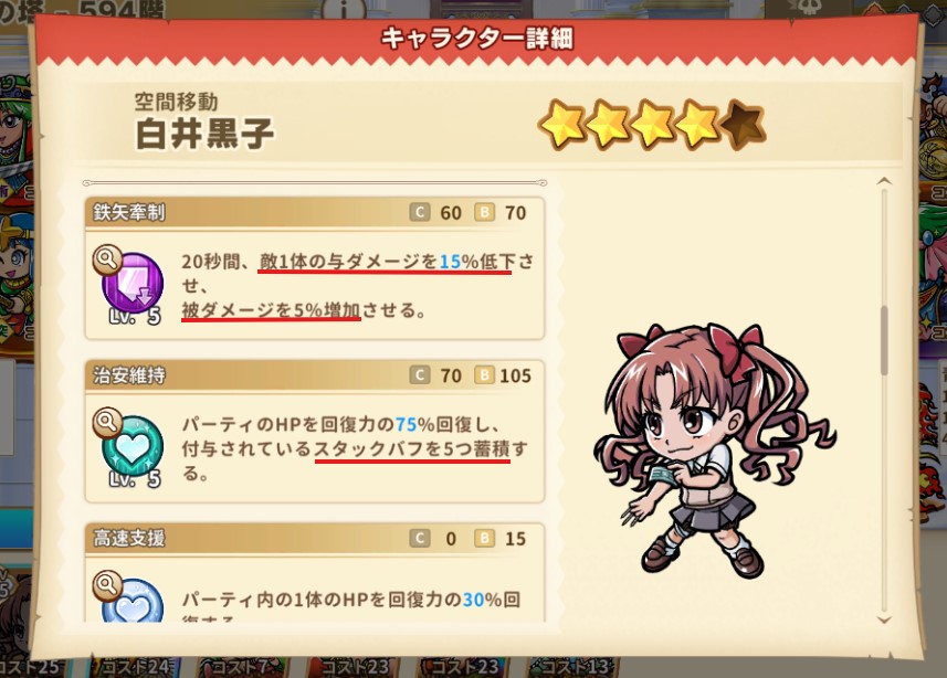 奥義も強いが白井黒子は通常スキルが優秀。敵の与ダメージダウンと被ダメージアップで味方が受けるダメージを抑え、味方の攻撃で与えるダメージを上げる事ができる。その上にパーティーにスタックバフを付与。