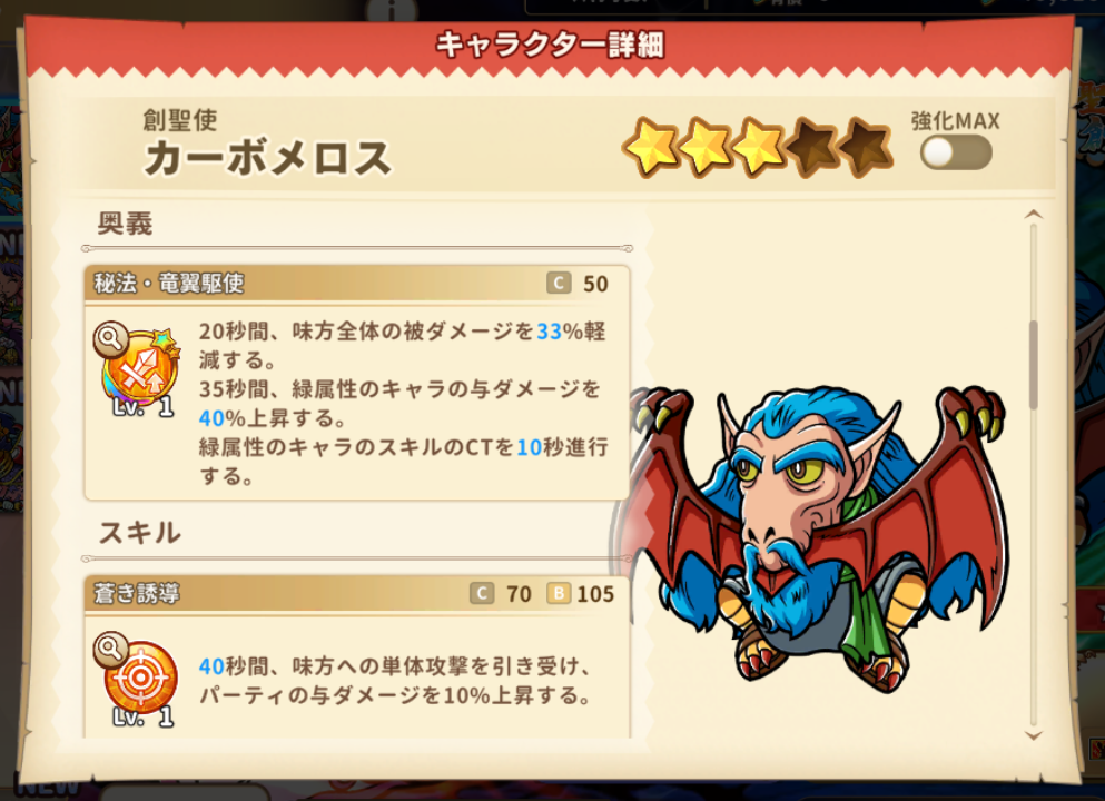 ![]() | ★3【創聖使】カーボメロス緑魔術前衛ヘッドHP:17298攻:4144奥義:【秘法·竜翼駆使】20秒間、味方全体の被ダメージを45%軽減する。35秒間、緑属性のキャラの与ダメージを60%上昇する。緑属性のキャラのスキルのCTを20秒進行する。BP+50%【蒼き誘導】60秒間、味方への単体攻撃を引き受け、パーティの与ダメージを10%上昇する。【CT:70】【BP:105】【源層初期秘術】50秒間、味方全体の与ダメージを15%上昇し、萎縮状態を解除する。【CT:90】【BP:120】【眼力法】敵1体に威力180%の緑属性攻撃を1回行い、与えたダメージの10%を吸収する。[回復上限:最大HPの15%]【CT:0】【BP:15】リーダー:【新なる決意】魔術系統キャラの最大HPを40%上昇し、緑属性キャラの与ダメージを30%上昇する。 |