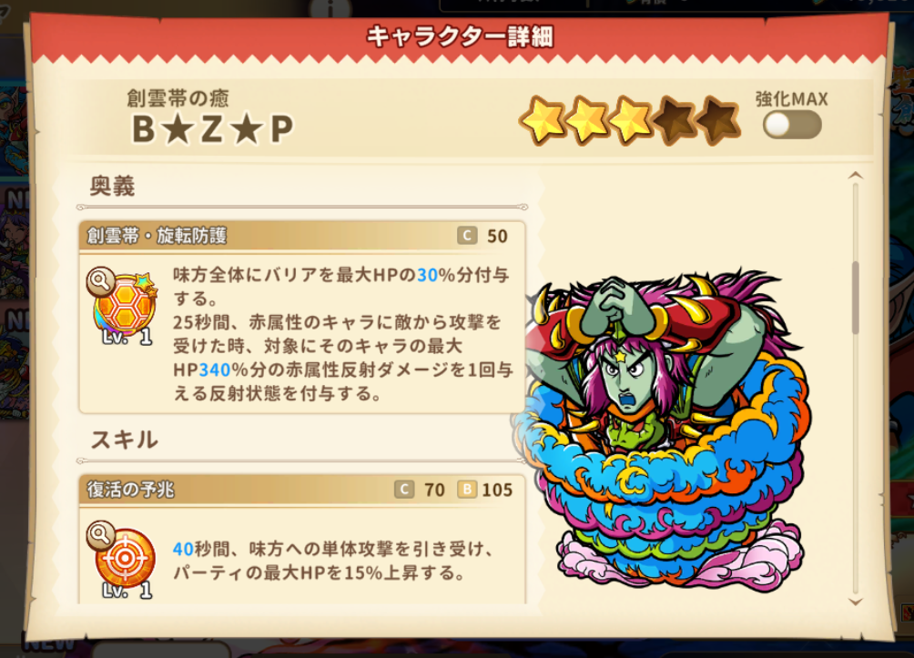 創雲帯の癒B★Z★PはリーダースキルのHP20%与ダメ55%だけでも価値がありそうだ。奥義では安定のバリアに加え全体に1回の反射を付与。ピンポイントで使えばかなり使えそうだ。スキルでの与ダメアップもあるので赤の火力は上がりそう。