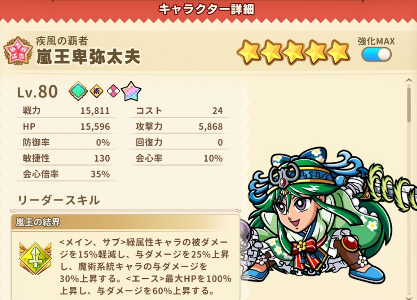 | パッシブスキル1 | HP、与ダメージ5%上昇 |