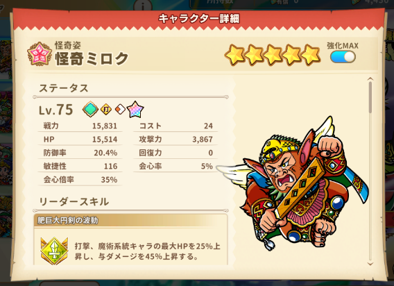 リーダースキル | 打撃、魔術系統キャラの最大HPを25%上昇し、与ダメージを45%上昇する。 |