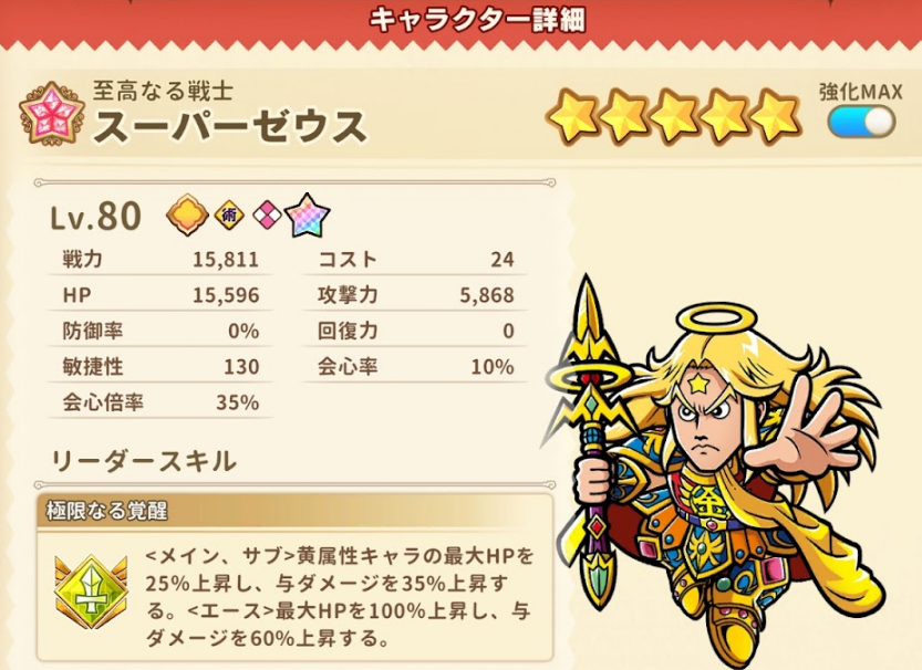 リーダースキル【極限なる覚醒】<メイン、サブ>黄属性キャラの最大HPを25%上昇し、与ダメージを35%上昇する。<エース>最大HPを100%上昇し、与ダメージを60%上昇する。