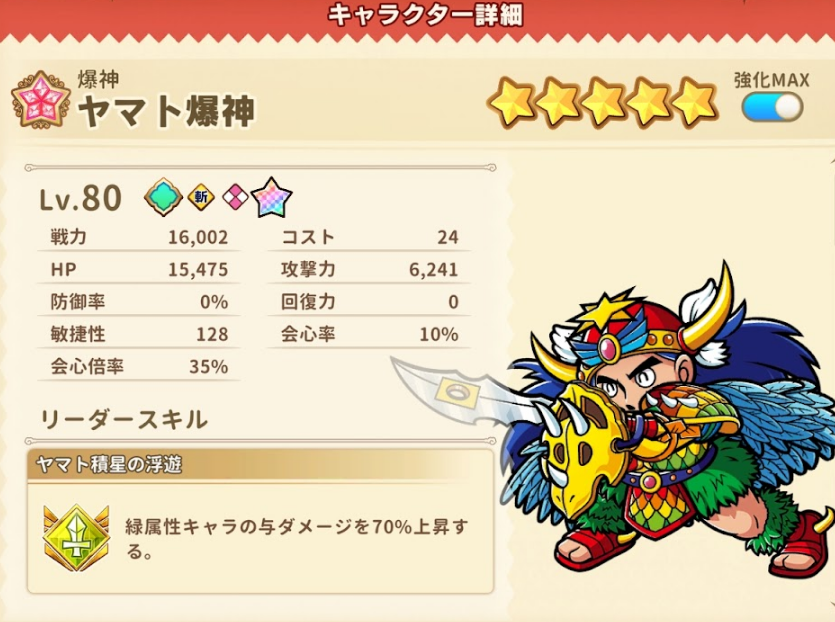| リーダースキル | 【ヤマト積星の浮遊】緑属性キャラの与ダメージを70%上昇する。 |