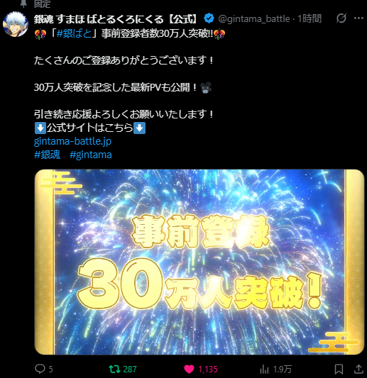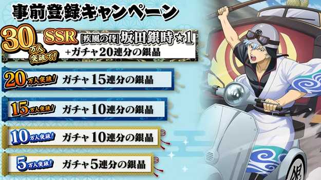 銀魂スマホゲーム『銀魂すまほばとるくろにくる』の事前登録キャンペーンの報酬まとめ。事前登録30万人突破でSSR[疾風の侍]坂田銀時、ガチャ合計60連分の銀晶が配布されるようです。