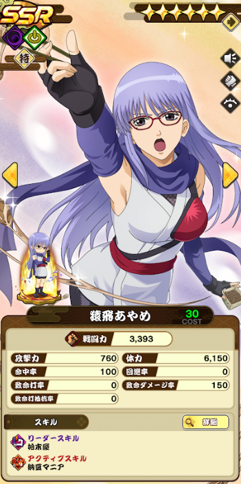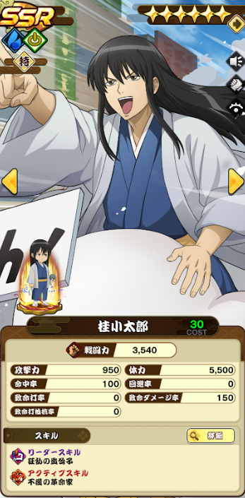 初回チュートリアル後に引ける「11回無料ガチャ」は確定で1キャラSSRキャラが獲得できます。排出されるSSRキャラ「柳生九兵衛」「猿飛あやめ」「神威」「桂小太郎」「近藤勲」の5キャラ、どれにしようか悩んだのですが、アニメで強い印象が強かった「神威」、銀ばと内でもごりごりの攻撃系のようなので「神威」で始めてみました。