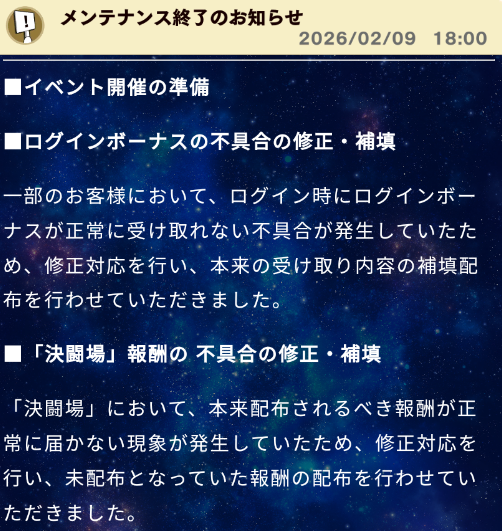 不具合内容 「決闘場」報酬の報酬が届かない不具合