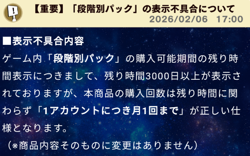 不具合内容 「段階別パック」の購入可能機関の残り時間が3000日と表示される不具合