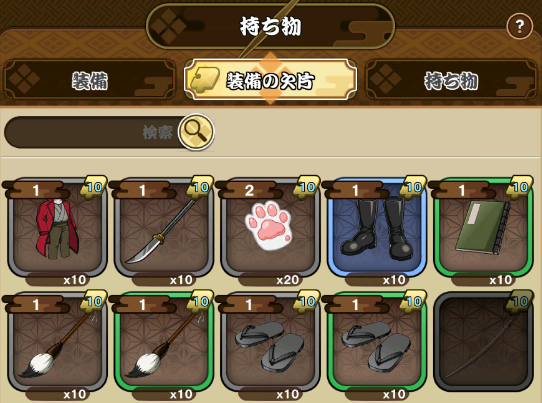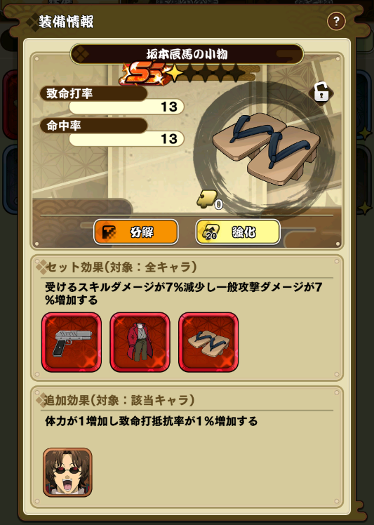 装備を装備するとキャラの能力値が上昇します。表示されたアイテムを全て着用するとセット効果を発揮します。また特定の装備を当該キャラが装着すると追加効果を受ける事ができます。