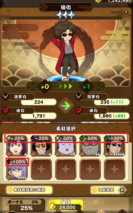 戦闘に使用しないキャラを素材として活用して基本能力値を最大+5まで強化できます。素材キャラ1体につき1回の強化試行として計算され、強化するキャラとの等級差によって成功確率が変化します。強化させるキャラの等級と強化を実行する時点の強化段階によってコストが変動します。
