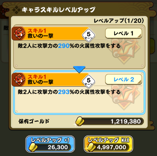 レベルアップにはゴールドが消費されスキルレベルに応じて効果が上がります。アクティブスキルのみレベルアップ可能でリーダースキルはレベルアップできません。
