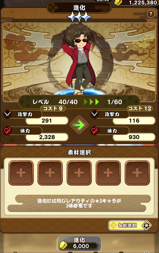 進化させるキャラと同じレアリティ・同じ等級のキャラを素材として使用できます。素材キャラは進化させるキャラの等級と同じ数だけ必要です。