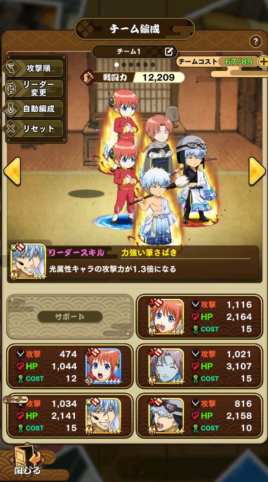 リーダースキルにはSSR[晴れ着]坂田銀時「光属性キャラの攻撃力が1.3倍になる」を採用しました。