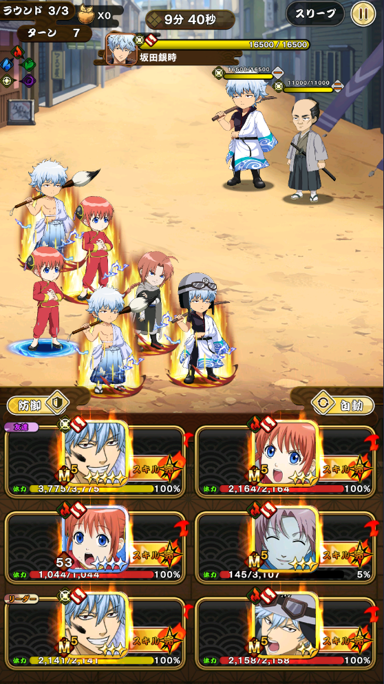 銀ばとの万事屋仕事の戦闘がサクサク進まなくなってきた方はキャラのレベル上げ、強化、進化などをしてパーティの強化をするのをオススメしますが、ガチャも引いたし出来ることがないよっ!!!って人は万事屋仕事などの自動戦闘を切って戦闘をするのを試してみるといいかもしれません。