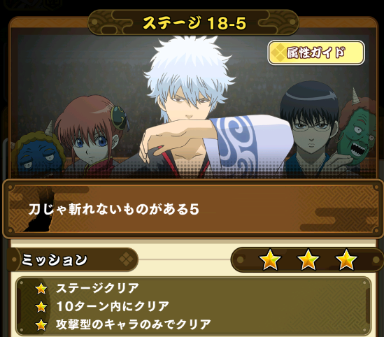 この記事の画像はメインストーリー18-5エクストラに挑戦したところなので、攻撃型のキャラのみでクリアのミッションの為、攻撃型キャラ×5体の編成になっています。