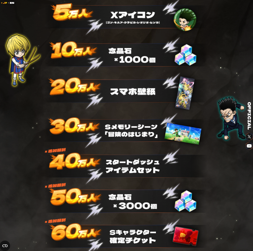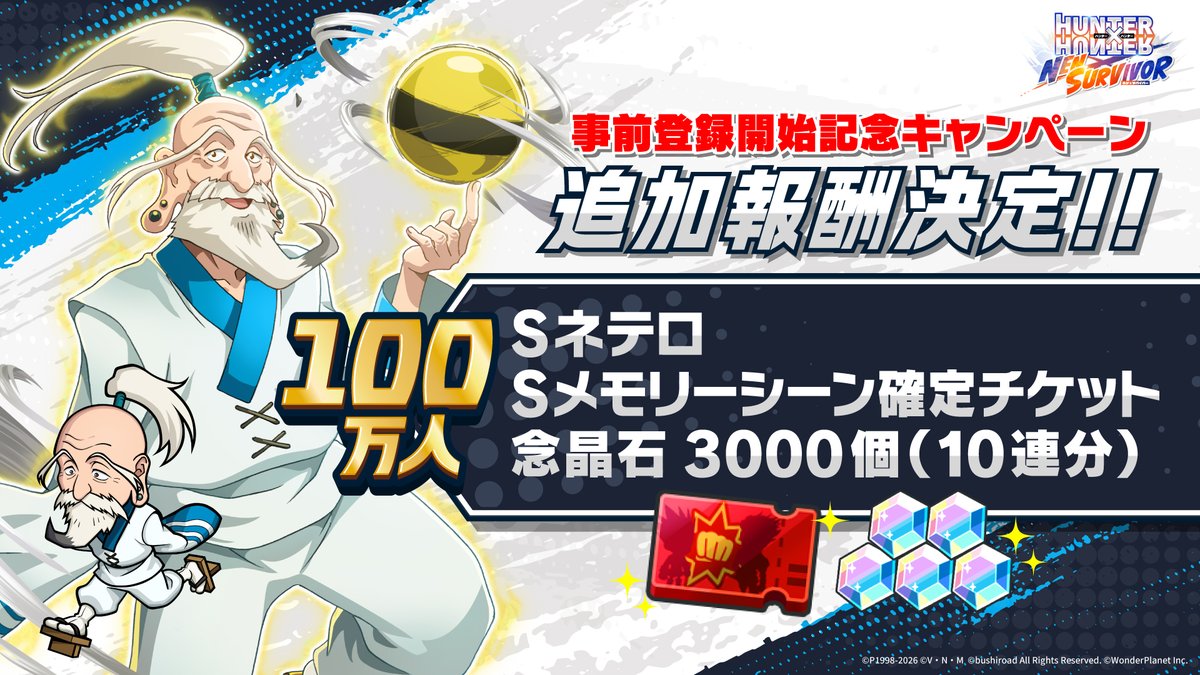 サバイバーアクションゲーム『HUNTERXHUNTER NEN×SURVIVOR(ネンサバ)』の事前登録キャンペーン報酬80万人突破、100万人報酬が追加配布決定!!100万人突破記念ではSネテロが配布されるようです。