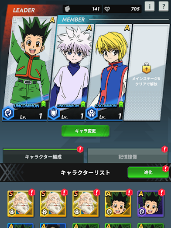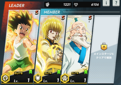 ガチャも渋いし1時間ぐらいリセマラやって疲れたのでディフェンダークラピカとゴンでリセマラ終了。耐久回復ビスケや貫通アタッカーのヒソカが来たら良かったのですが、クラピカ来たらよし!で妥協しました。