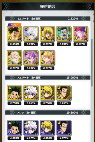 Sエリートキャラの排出割合は2.2%とかなり低め。この中から、Sネテロ、そして事前登録報酬で出たランダムSキャラと被らないキャラとなるとリセマラは結構厳しいものがあります。