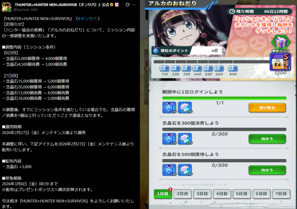 アルカのおねだり、ハンター協会の依頼のミッション内容、調整きたーーー!!無課金では達成できないから2 … 続きを読む 念晶石3000配布!アルカのおねだりミッション緩和は27日メンテ後!【ネンサバ】
