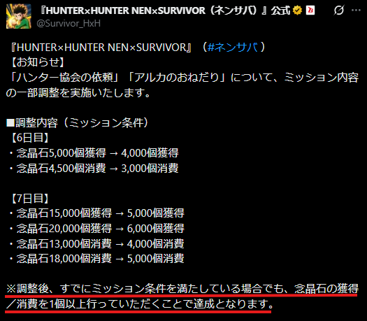 「調整後、すでにミッション条件を満たしている場合でも念晶石の獲得/消費を1個以上行っていただくことで達成となります。」とあるので、ミッション条件を満たしていて達成になっていない場合は、念晶石の獲得/消費を1個以上してみましょう。