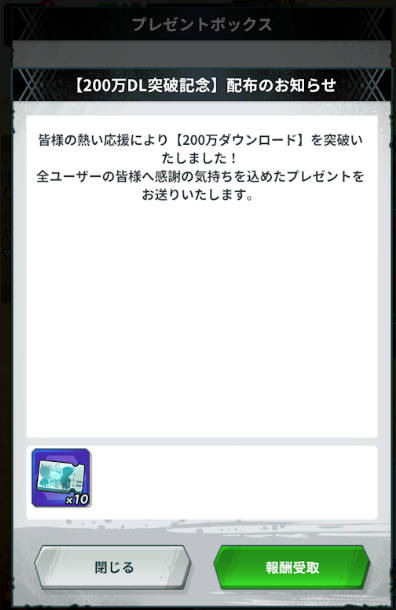 | 200万ダウンロード突破記念 | キャラクターガチャチケット ×10 |