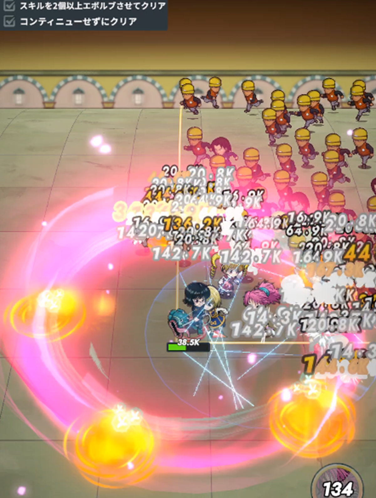 アルティメットスキル「広範囲にダメージを与える。さらに一定時間周囲にダメージを与え、一部の遠距離攻撃と毒を防ぎ、フィールド上のオーラを回収する」はけっこう便利です。広範囲攻撃とオーラ吸い込みが一定時間続くので雑魚が増えた時に強化しつつ耐える事ができる。