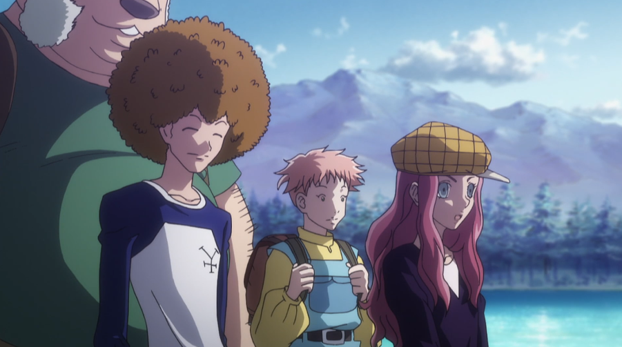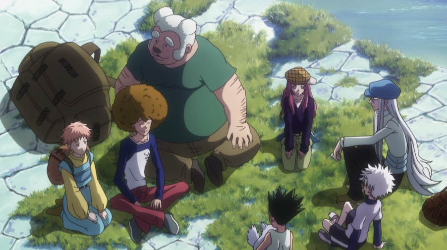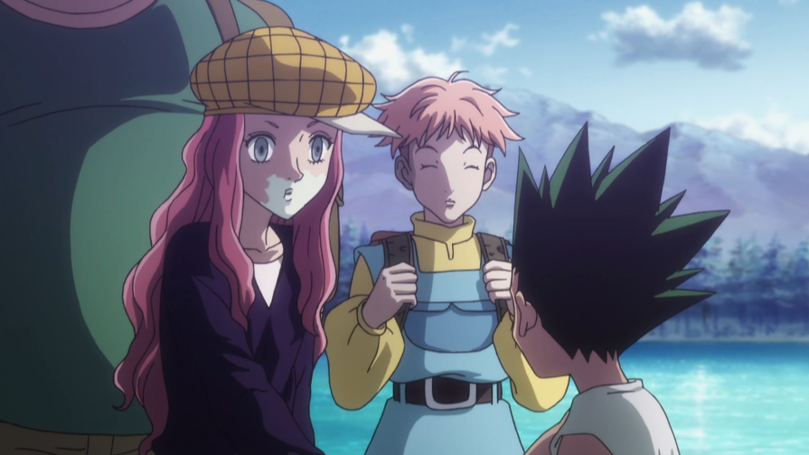 ゴンの名前「ゴン・フリークス」と聞いてフーセンガムを割ってしまうスピン。ジンの子だということにびっくりしているのがわかる場面。