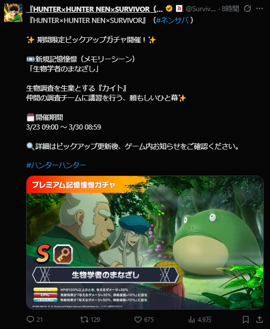 HUNTER×HUNTER NEN×SURVIVOR(ネンサバ)の新しい記憶憧憬はカイト、モン、スピンが描かれたイラスト「生物学者のまなざし」が追加されるようです。効果はHPが100%以上のとき与えるダメージアップ!!そしてカテゴリは「鍵」。