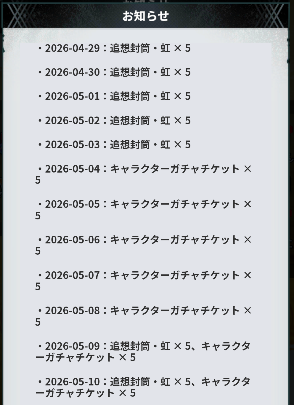 | 5/10 | 追想封筒・虹×5 キャラクターガチャチケット×5 |