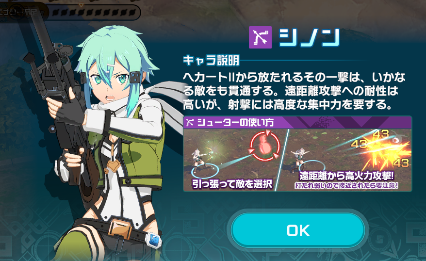 シノンはシューターです。シューターは、基礎ステイタスとして「ダメージカット率(遠)」をもち、移動せずにその場から攻撃することができるので、遠距離での戦闘を得意とします。他のロールに比べて攻撃力が高いですが、HPが低く打たれ弱い特徴があります。