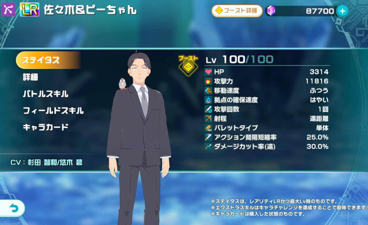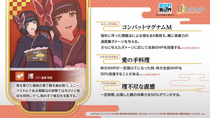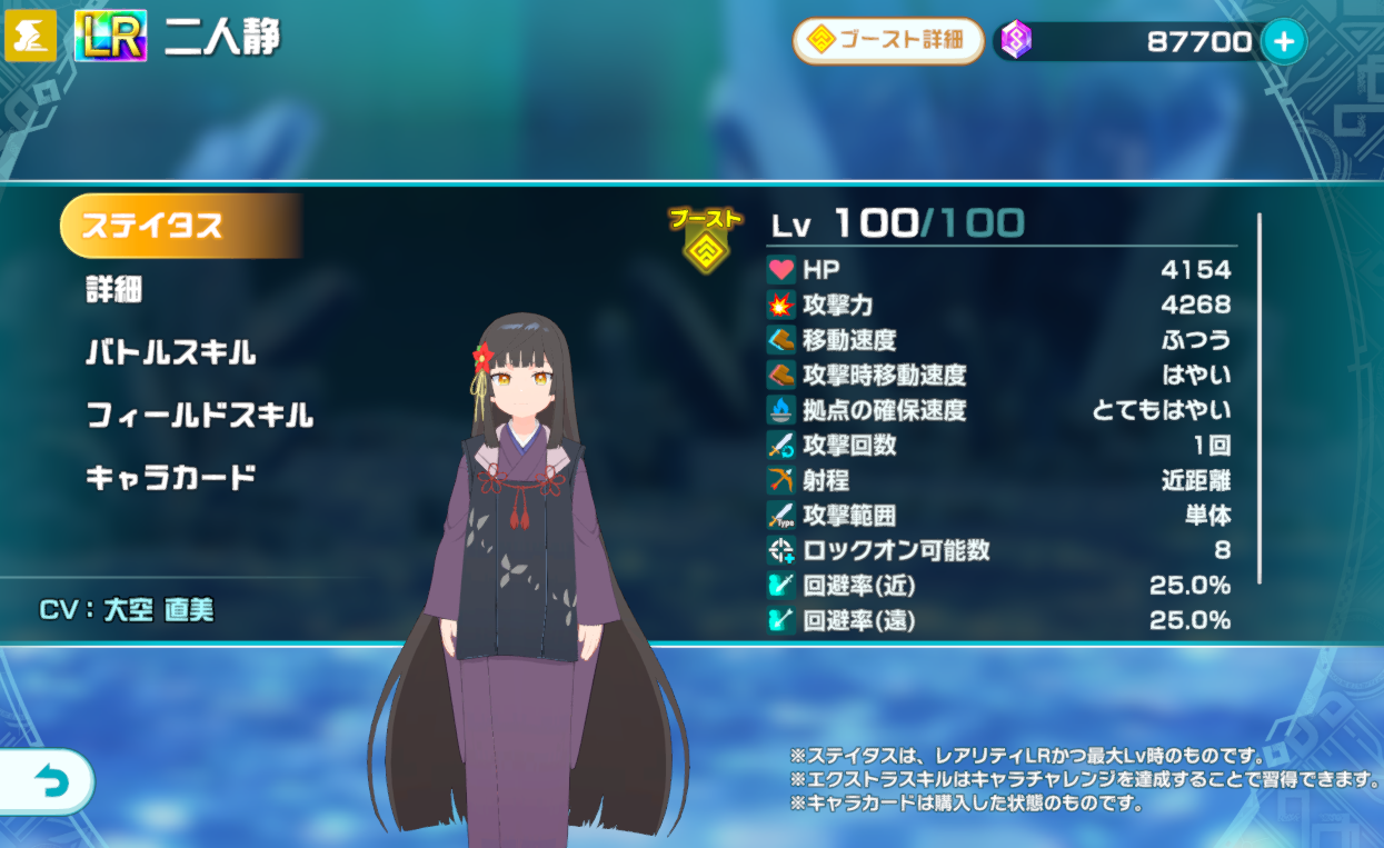 | フィールドスキル2 | 【隠密】気配を消し敵の散策を掻い潜ることができる能力。攻めるか逃げるかは使い手次第。 |