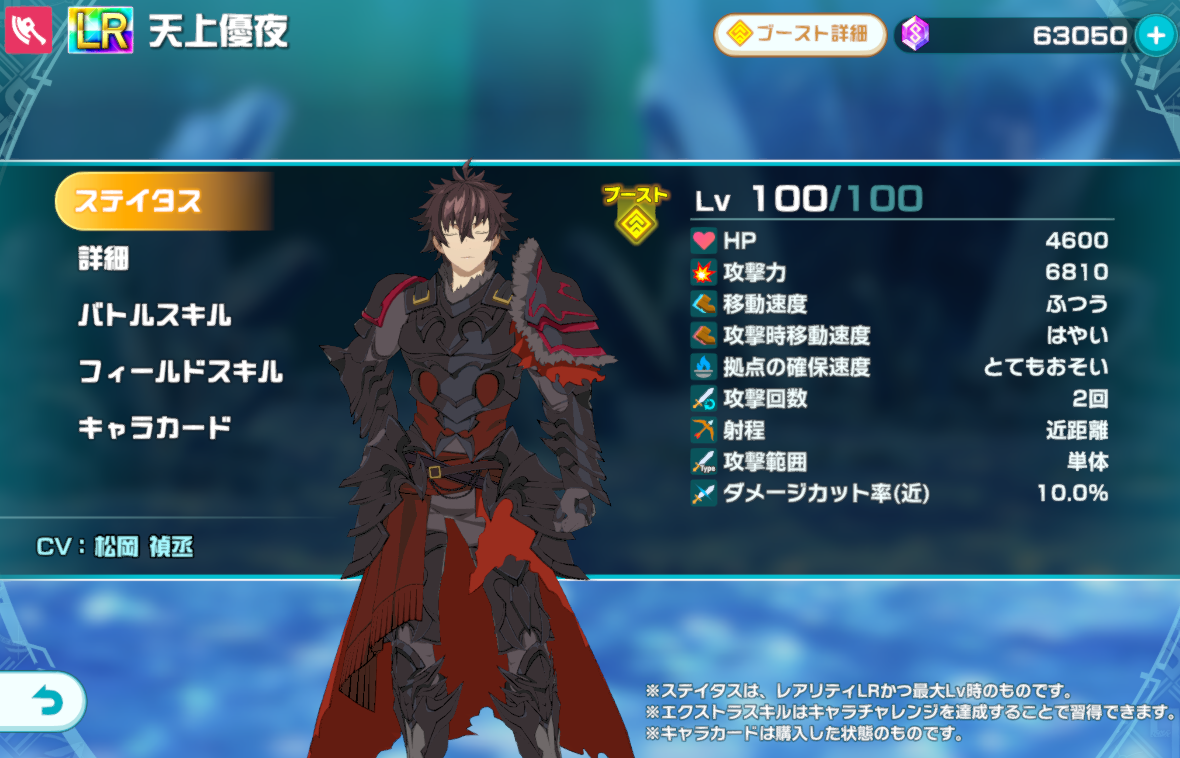 天上優夜はウォリアーです。ウォリアーは、基礎ステイタスとして「ダメージカット率(近)」をもつため、近距離攻撃を得意とします。ウォリアーだけが「アタックスキル」を習得することができ、距離が離れた敵をターゲットすることで発動します。アタックスキルは、同じウォリアーでもキャラによってアタックスキルLvの上限が異なるなどの違いがあります。