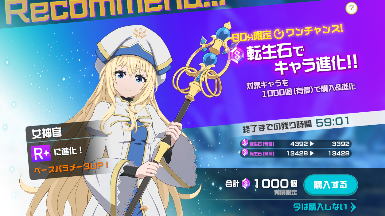 ガチャでキャラ入手時のタイミングで約1000円で凸を1つ上げる事ができます。購入可能時間は入手から1時間です。完全無課金でないならかなりお得な仕様です。2体確保してSRまで上げるのがオススメです。