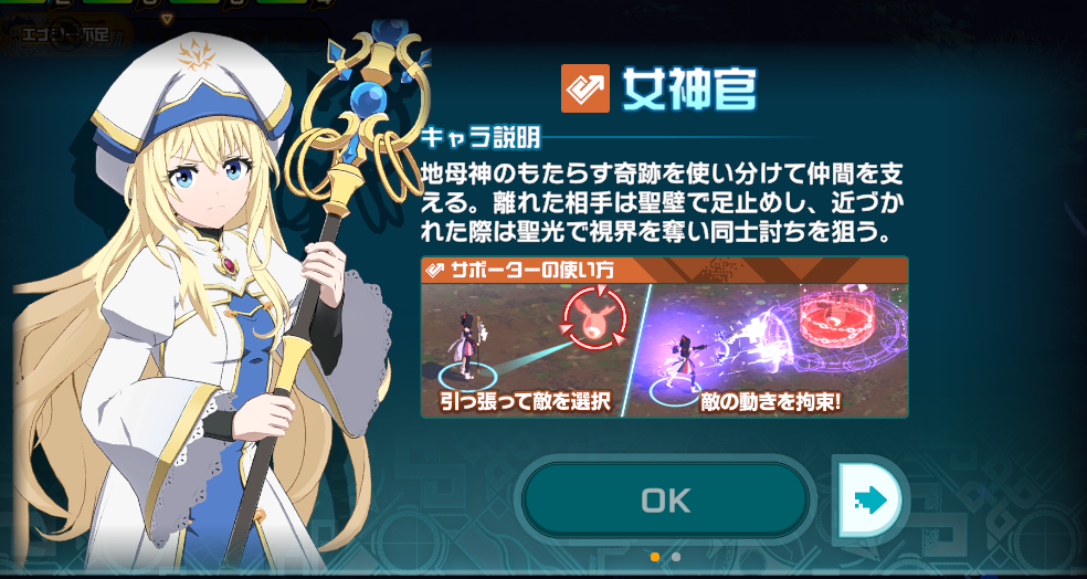 ゴブリンスレイヤーは天上優夜と同じく遠距離攻撃ができるウォリアーだが貫通効果がない。しかしエクストラスキルでの範囲攻撃があります。女神官はバインド+混乱の新しいタイプのサポーター。エクストラスキルでの全体回復もある。