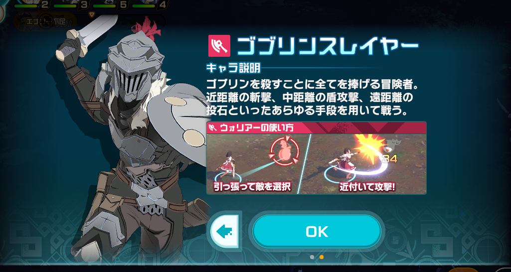 - フィールドスキルが多く、投石・盾攻撃、斬撃とアクションが変化するゴブリンスレイヤー、エクストラスキルは火炎瓶での範囲攻撃【ウォリアー】