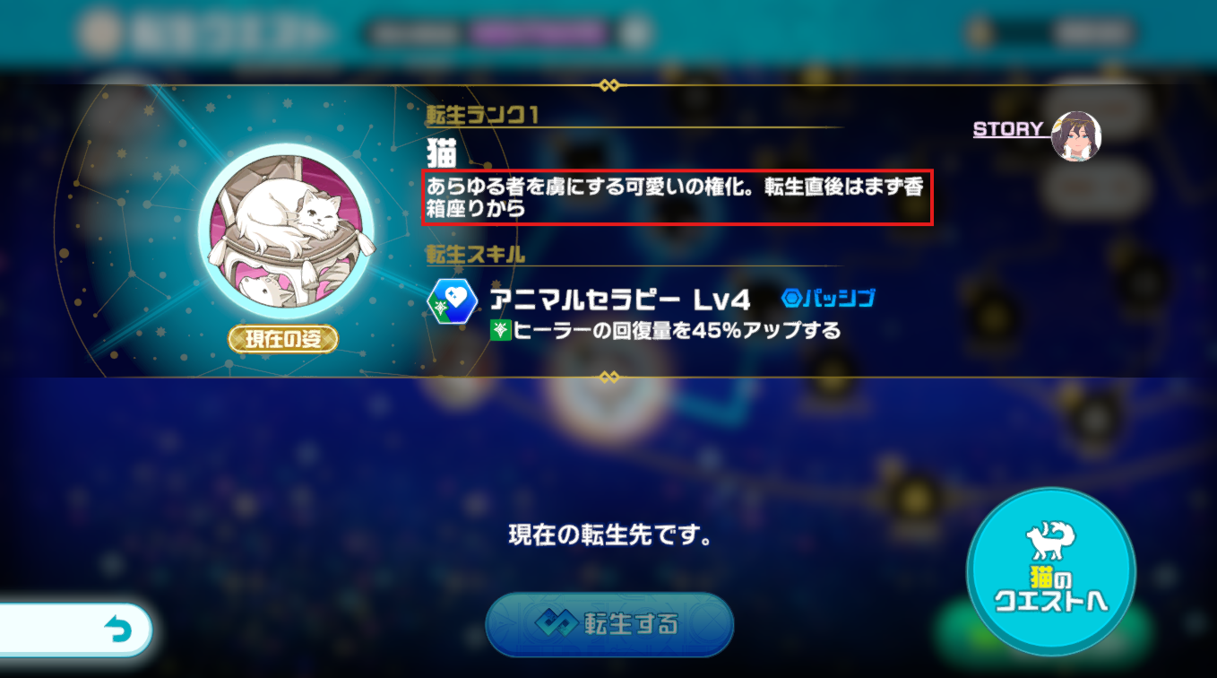 転生クエスト「猫」の説明文で確認できます。「あらゆる者を虜にする可愛いの権化。転生直後はまず香箱座りから」。とうことで答えは「香箱座り」です。