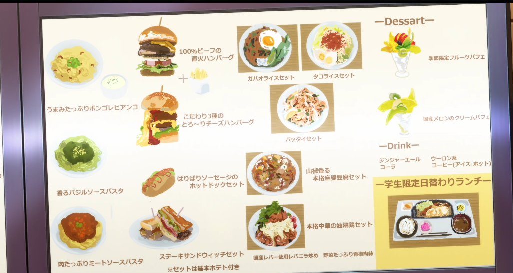 シーズン1エピソード2 – 王政学園で学食のメニューを見ながら日替わりランチの値段を紹介しています。答えは「0円」です。