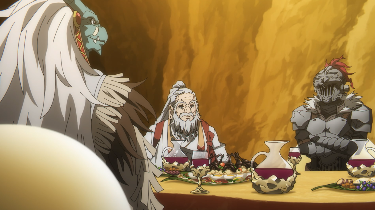 オープニング曲の前なので見逃してしまいそう。ゴブリンスレイヤーが「あれが象か?」と発言しています。答えは象です。