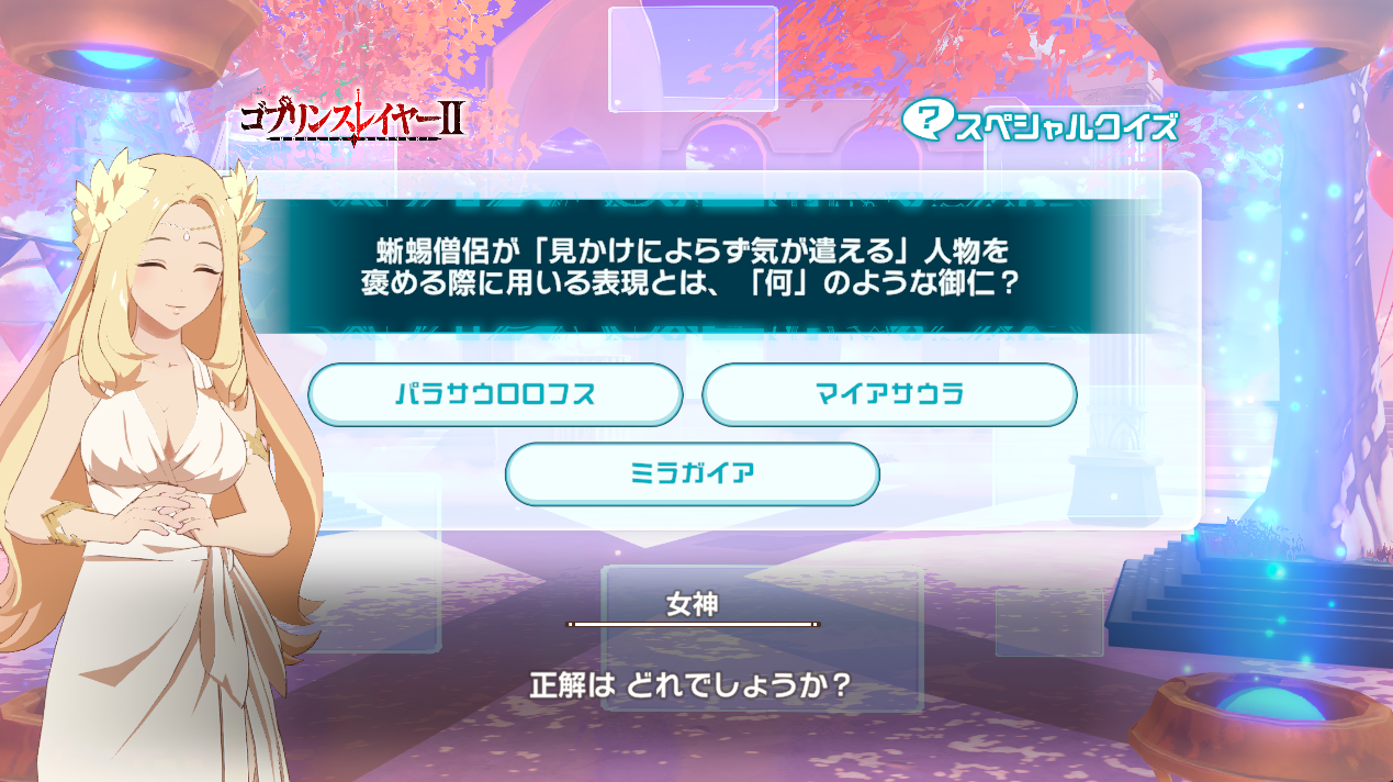 今回のクイズもゴブリンスレイヤーⅡ第6話「エルフ王の森」で確認。水着シーンがある回ですが運営ここ好きすぎてない?
