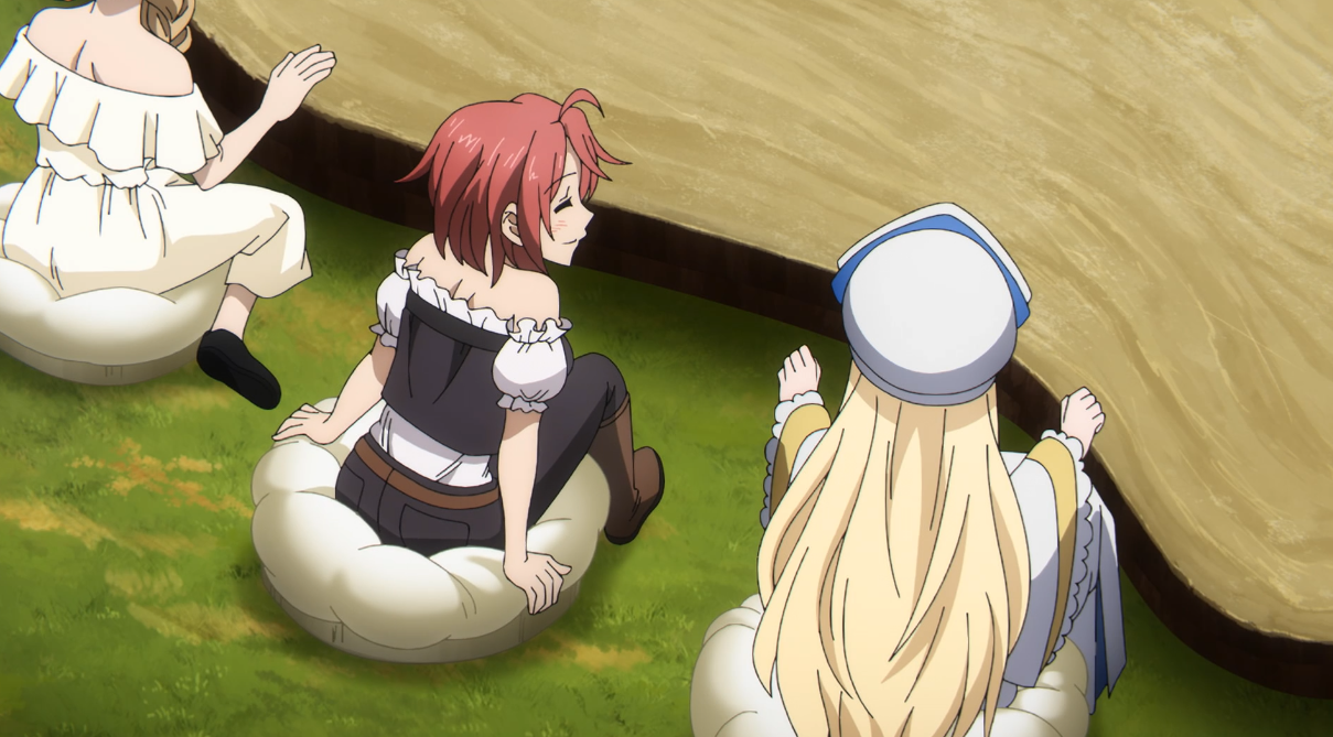 エルフの国のきのこクッションではしゃぐ牛飼娘と女神官。