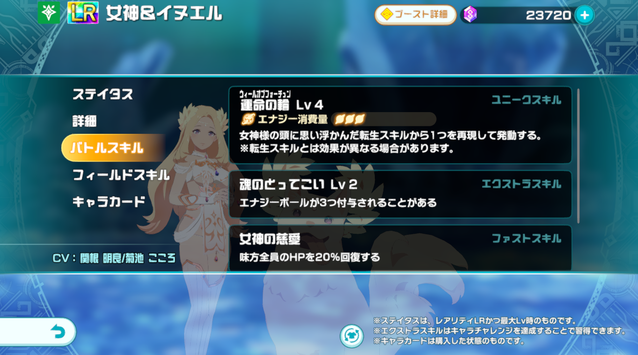 性能はカタログスペックではリリアは一般的なウォリアー、女神はヒーラーでランダム要素強そうなユニークスキル。転生スキルチャージ速度アップとエクストラスキルは無駄がなさそうかな?
