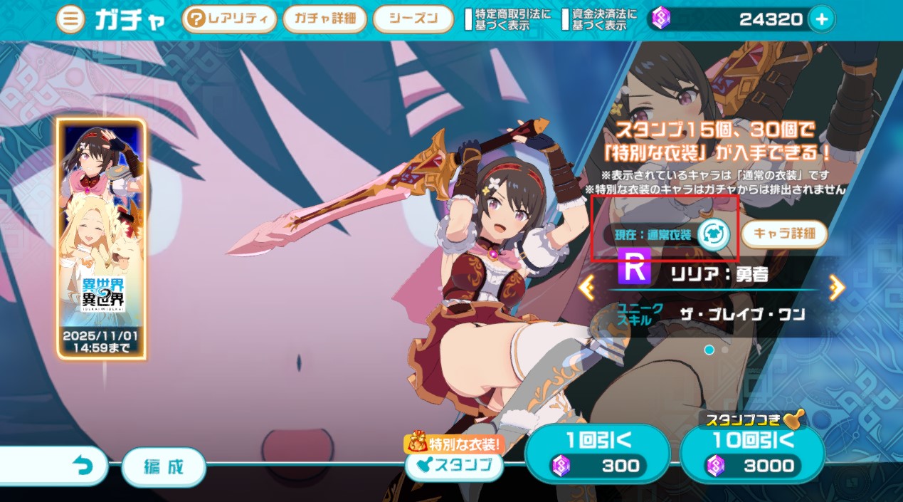 異世界∞異世界のオリジナルキャラクターのガチャでは「特別な衣装」が入手できますが、ガチャから直接入手する事はできません。ガチャのスタンプカードから特別な衣装を入手する事ができます。