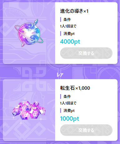 ミッションでポイントを貯めると、進化の導きや転生石1000個を入手する事ができる。他にもウエハース開封時短チケット×150、プレゼントアイテム10種セット×1(条件1人10回まで)があります。