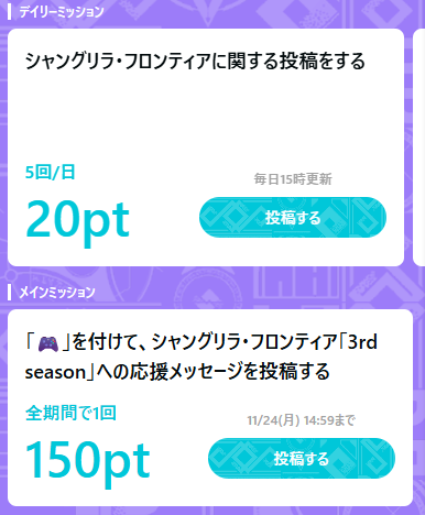 • 「🎮」を付けて、シャングリラ・フロンティア「3rd season」への応援メッセージを投稿する 全期間で1回 100pt